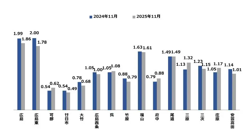 広島県の11月の地域別有効求人倍率は、広島が最も高く1.86倍、次いで広島東が1.78倍と高くなっております。