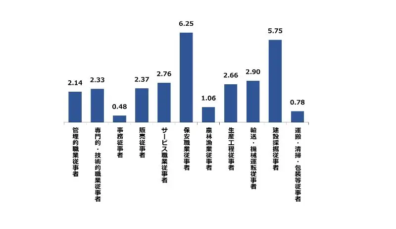 広島県の1月の職種別有効求人倍率は、保安職業従事者が6.25倍、建設・採掘従事者が5.75倍と高くなっております。