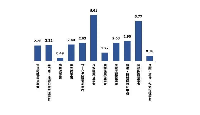 広島県の2月の職種別有効求人倍率は、保安職業従事者が6.61倍、建設・採掘従事者が5.77倍と高くなっております。