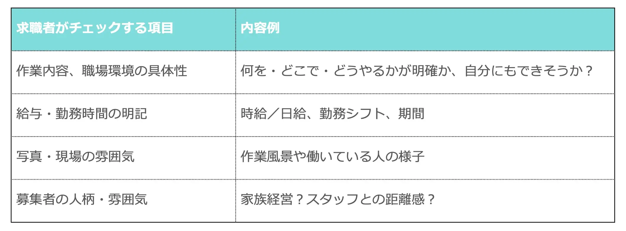 さらに「作業の流れを写真で見せる」「持ち物を一覧で提示する」といった工夫をすると、入社後のミスマッチを防げます。