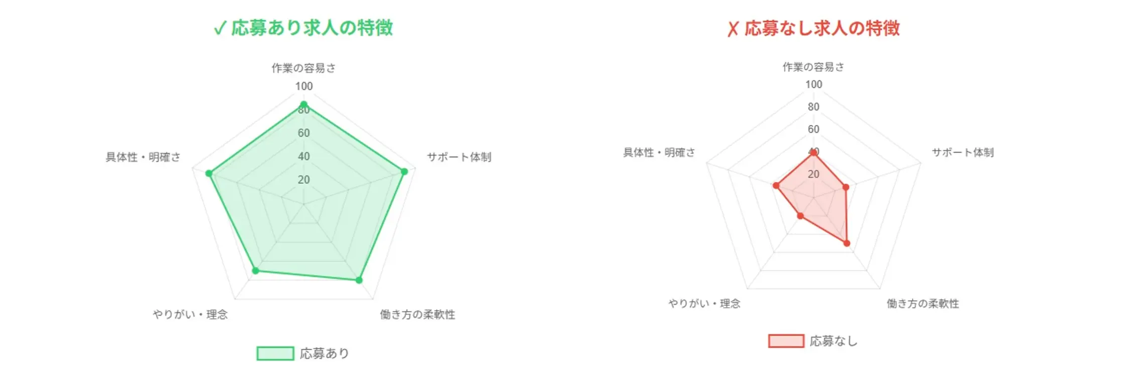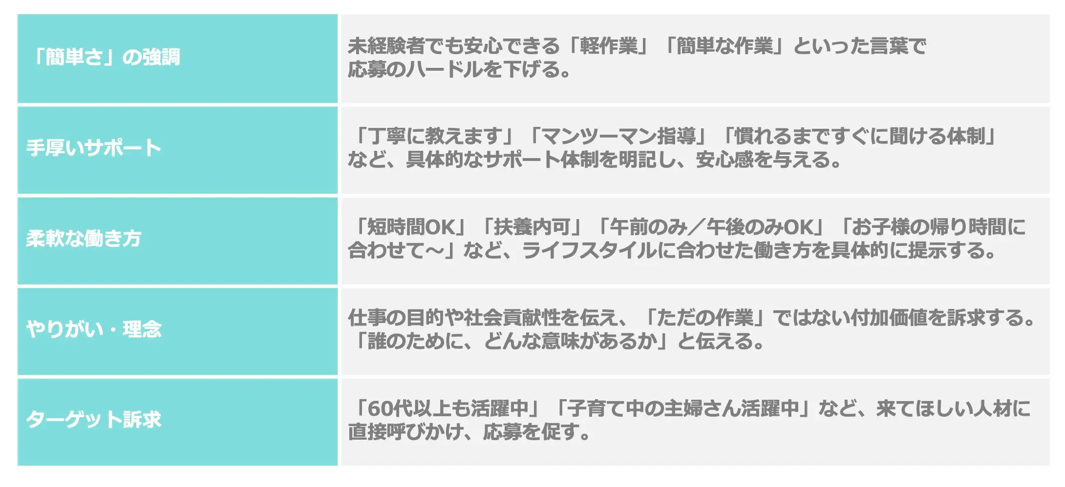 そのため、求人原稿で「簡単さ」「安心感」「やりがい」を具体的に表現することが、応募者の心理的ハードルを下げる鍵となります。