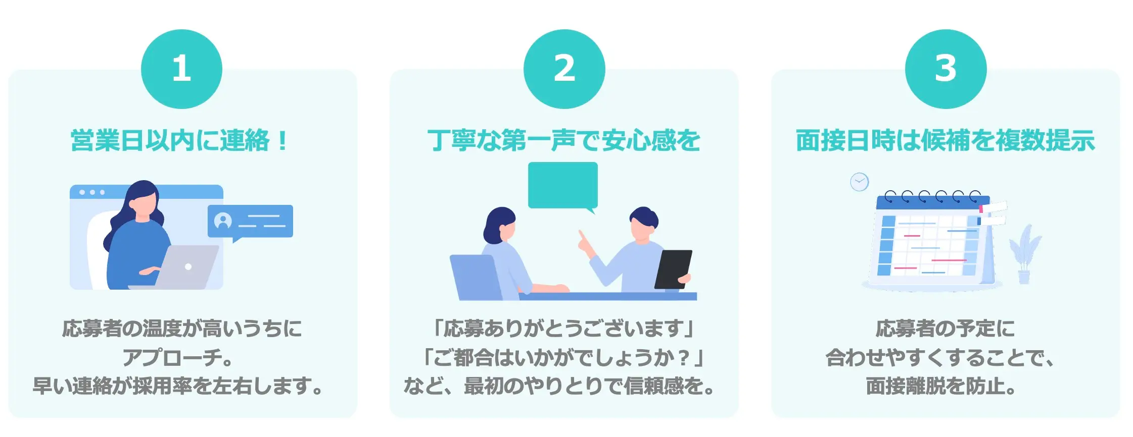 最低でも1日以内に返信し、応募者の温度感が高いうちに面接に繋げましょう。