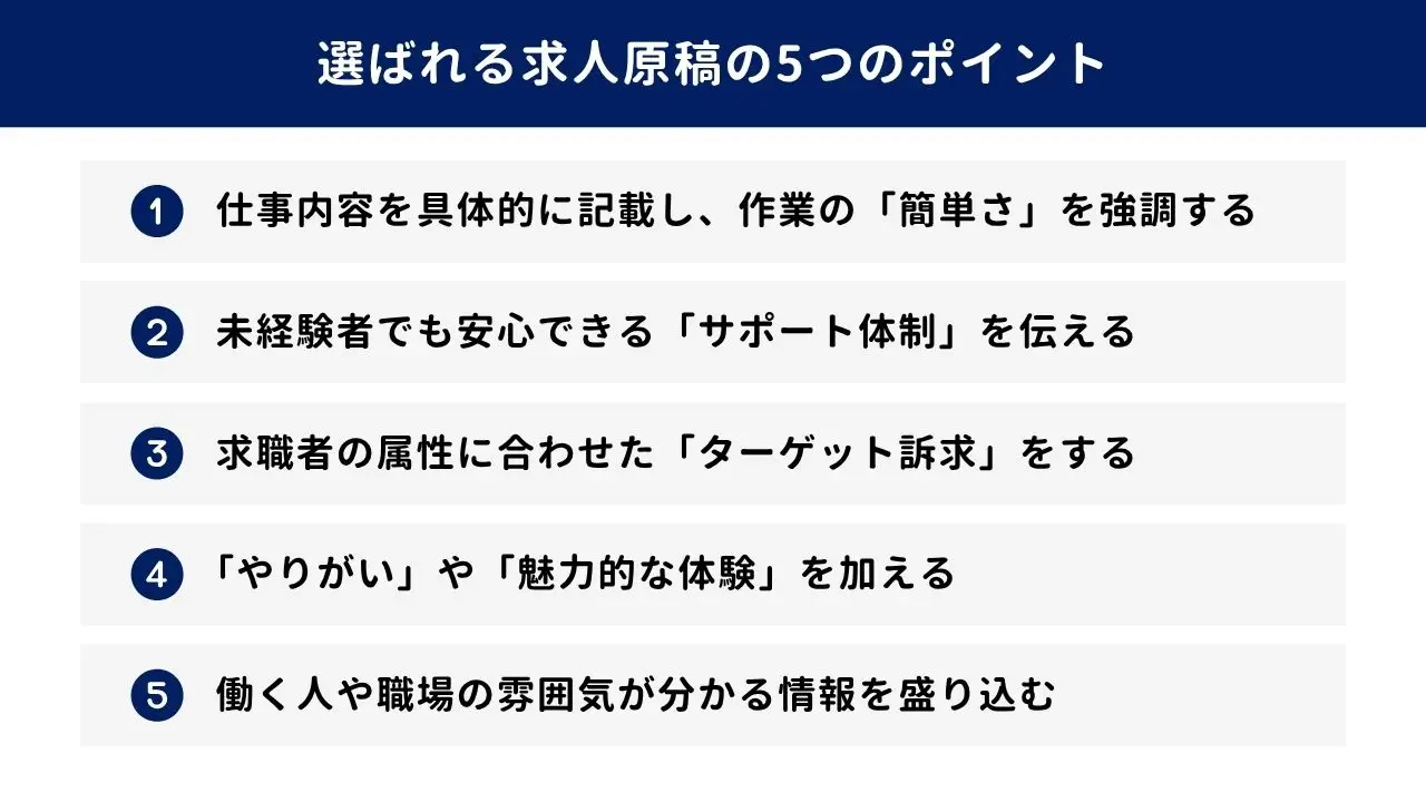 上記をふまえた求職者に選ばれる求人原稿の5つのポイントは以下の通りです。
