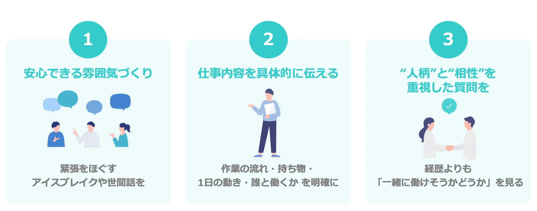 面接では、応募者が安心できるように「仕事内容」「1日の流れ」「一緒に働く人」を具体的に説明することが重要です。