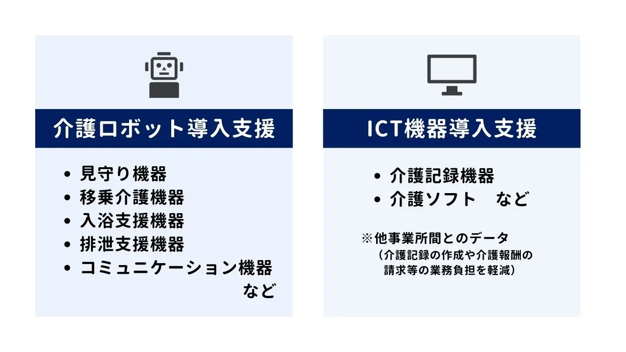 介護職員の身体的・精神的負担を軽減し、離職防止や職場定着に資するとともに、介護サービスの質の向上を図るために、介護分野のICT化等事業(介護ロボット導入支援事業、ICT導入支援事業)を実施する介護事業所を運営する法人の長に対し、都道府県や市町村などの自治体が実施している補助金制度です。